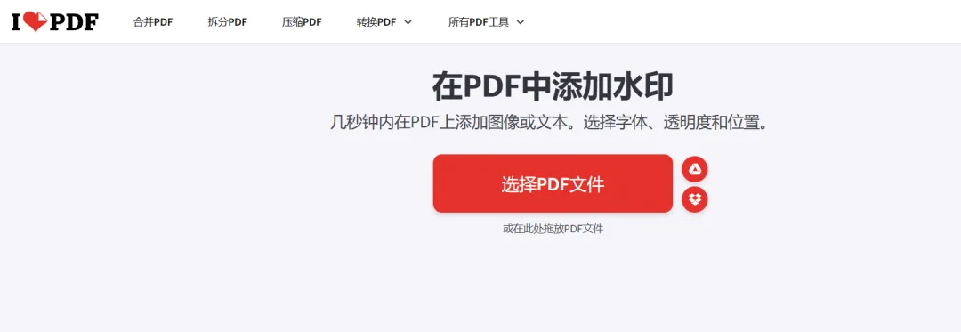 以给现有PDF文件,在网站中选择“水印”工具,即出现“PDF添加水印界面”,首先需要添加需要添加水印的PDF文件。可以选择文件,或者将文件拖动到当前窗口即可。