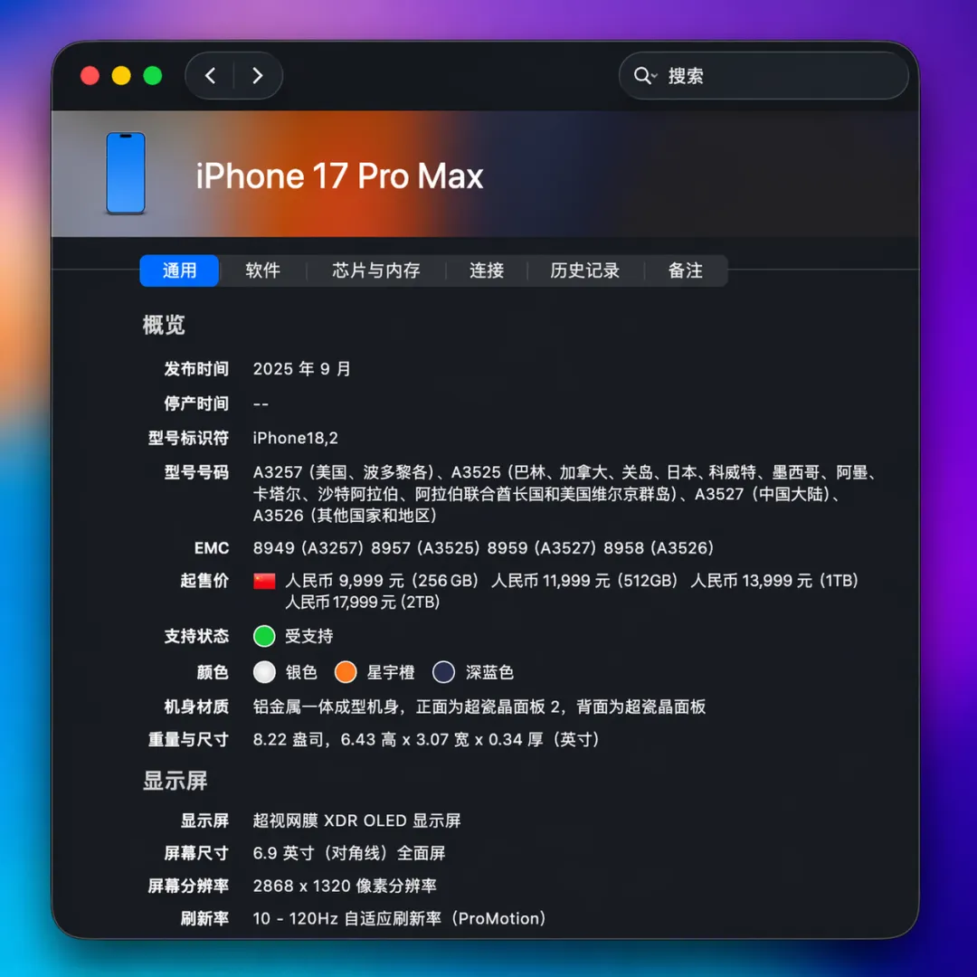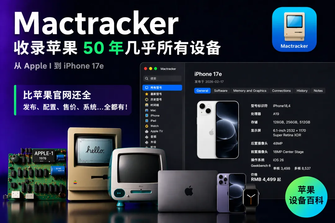 • Mactracker:苹果设备百科全书 • 时间线分类 • 外设 • 产品细节 • Geekbench 6 跑分 • 智能分类 • 记录我自己的设备 • 保存到 iCloud • 比较产品 • 总结 && 免费 • 获取 • 小彩蛋