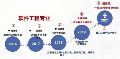 2013年,软件学院承担福建省职业院校技能大赛(高职组)电子信息类2个赛项的组织工作,接待了省内10多所兄弟院校的30支代表队共计100名左右参赛选手和指导教师,圆满完成大赛承办任务;2014年软件学院专业实验室荣获福建省“软件适用人才重点培训基地”荣誉;2015年,获福建省中青年教师教育科研项目2项,大学生创新创业训练计划项目国家级2项、省级2项;2016年软件工程专业荣获福建省高等学校服务产业特色专业建设立项,获批设立教育部和中兴通讯共建的ICT产教融合创新基地,获福建省云计算与物联网技术福建省高校重点实验室;2019年获教育部批准的福建省首批一流本科专业;2021年获批国家级一流本科专业建设点,并在积极申报软件工程专业的工程认证。