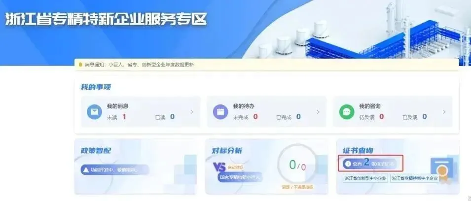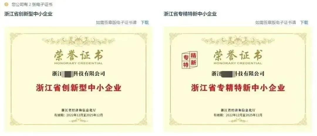 进入浙江省专精特新企业服务专区后,点击【证书查询】-点击【下载】按钮,即可下载电子证书。