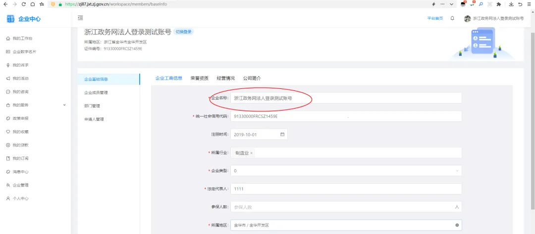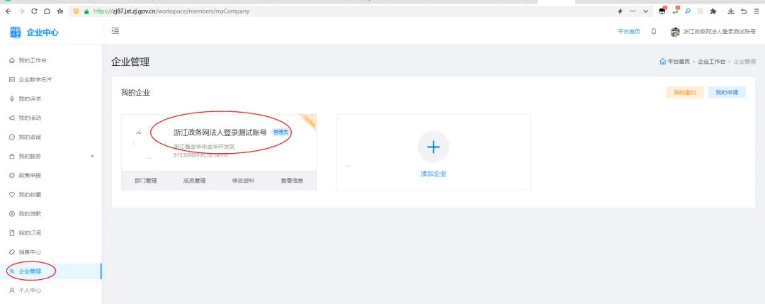 ② 进入“企业中心”后,点击“企业管理”,选择对应企业