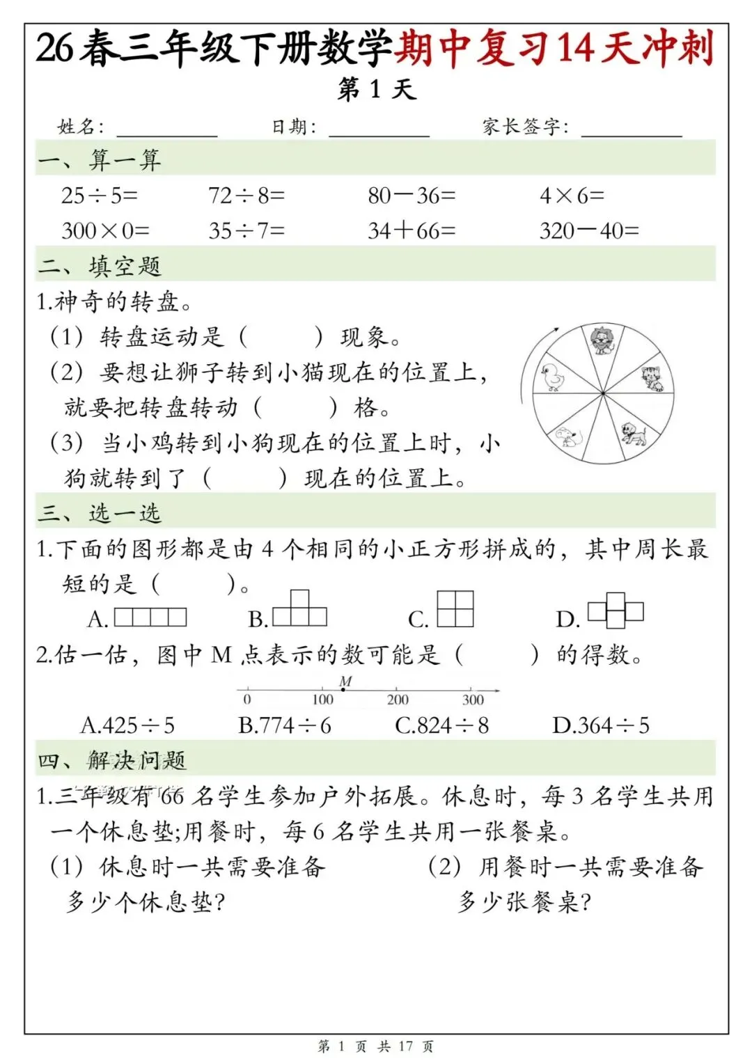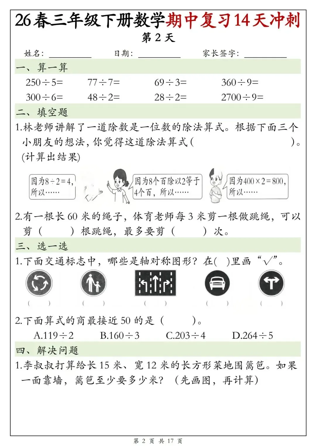 重点突破“除数是一位数的除法”“周长计算”“平移与旋转”“两步应用题”等三年级下册核心考点,并设置“商的中间/末尾有0”“长方形拼剪”等易错题,提升孩子逻辑思维与解题能力。