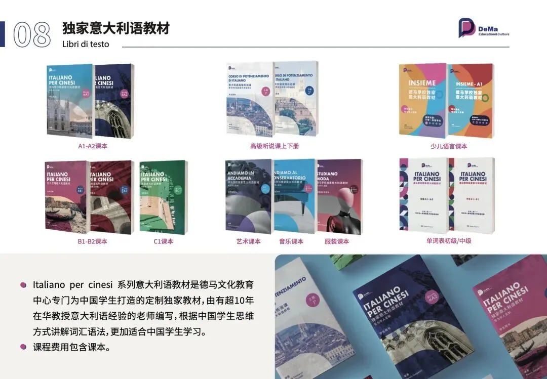 为提升学生的阅读及综合能力,DeMa学校编写并出版了B2等级阅读《Non vedo l'ora che arrivi domani》。本书难度较课堂教材略有提升,内容更贴近真实生活语境。每个章节均配有练习题及参考答案,便于学生进行自我检测与巩固。
