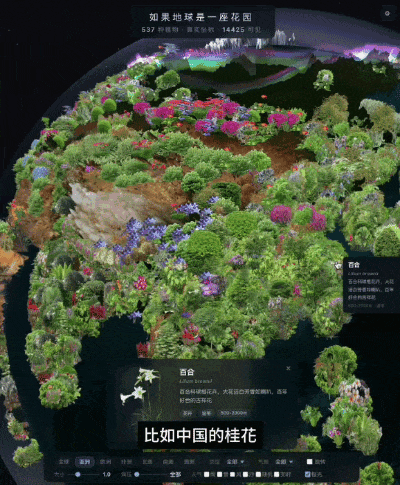 比如“如果地球有自己的花语”视频中,他做了一个地球植被系统——可以直观看到中国的桂花和百合,地中海的无花果和金盏菊,非洲的金合欢和猴面包树……还加入了全球实时天气系统,转动地球,世界各地的花朵在你眼前轮番绽放。有网友留言:“好美,看哭了是怎么回事”。