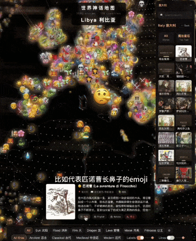 还有“世界神话地图”,点击地图上的emoji,就能听到对应的故事——匹诺曹的长鼻子、白雪公主的魔镜。更绝的是,他加入了跨文化对比功能:中国的大禹治水和诺亚方舟讲的是同一个母题,世界各地关于火、关于龙的故事,竟然跨越万里连接在了一起。评论区有人感叹:“这就是AI时代的意义,把全人类的故事连在一起。”