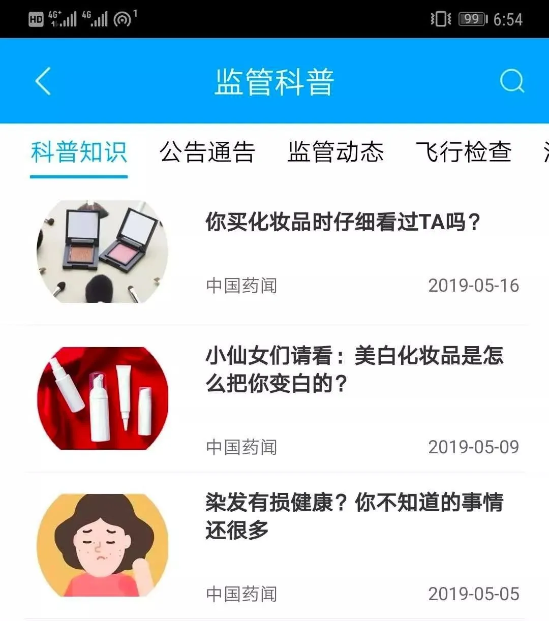具有化妆品数据查询、专题科普、投诉举报等多种功能