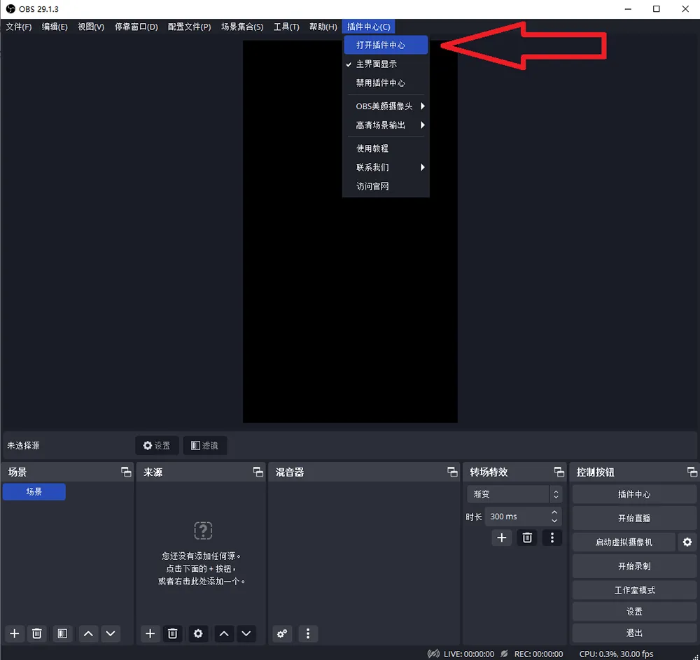 打开刚刚安装的OBS直播软件,然后登录插件中心,如下图所示
