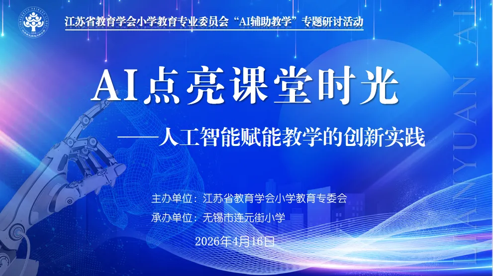4月16日,江苏省教育学会小学教育专委会“AI辅助教学”专题研讨活动在无锡市连元街小学成功举办。本次活动以“AI点亮课堂时光——人工智能赋能教学的创新实践”为主题,由江苏省教育学会小学教育专业委员会主办,无锡市连元街小学承办。