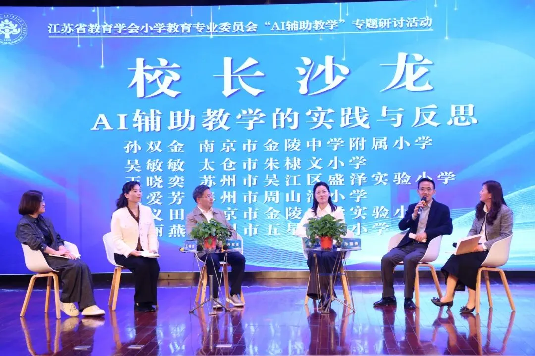 校长沙龙环节由南京市金陵中学附属小学孙双金校长主持,太仓市朱棣文小学吴敏敏、苏州市吴江区盛泽实验小学王晓奕、泰州市周山河小学顾爱芳、南京市金陵中学实验小学何义田、常州市五星实验小学孙丽燕五位校长,围绕AI技术落地课堂的真实案例与困惑展开深度对话。