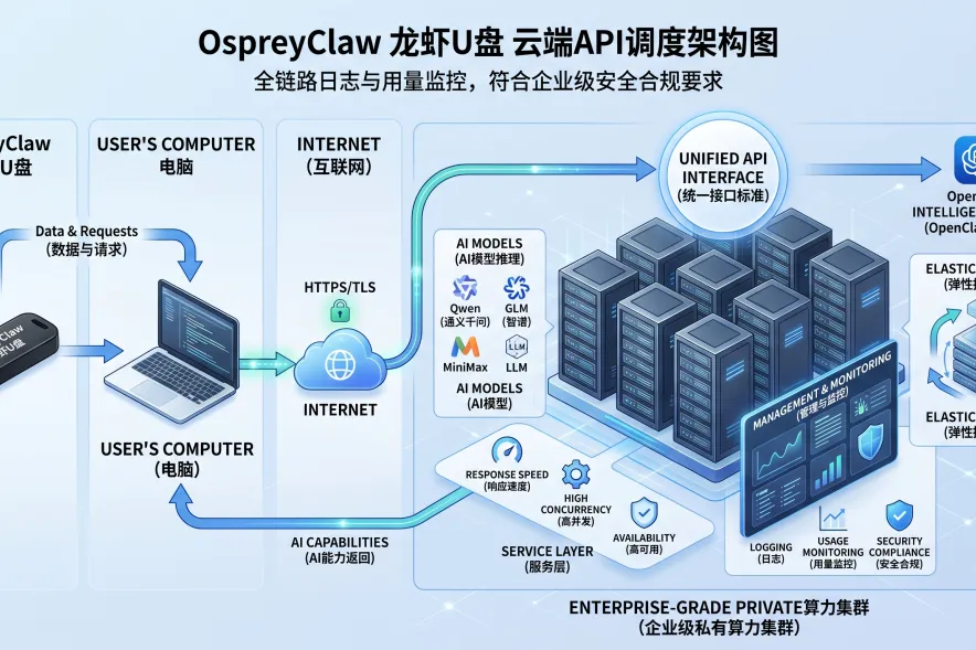 OspreyClaw龙虾U盘不支持本地离线推理,所有AI能力均通过我司企业级算力集群提供云端API调度,确保模型能力、响应速度、并发稳定性与服务可用性达到商用标准,适配企业级使用需求。