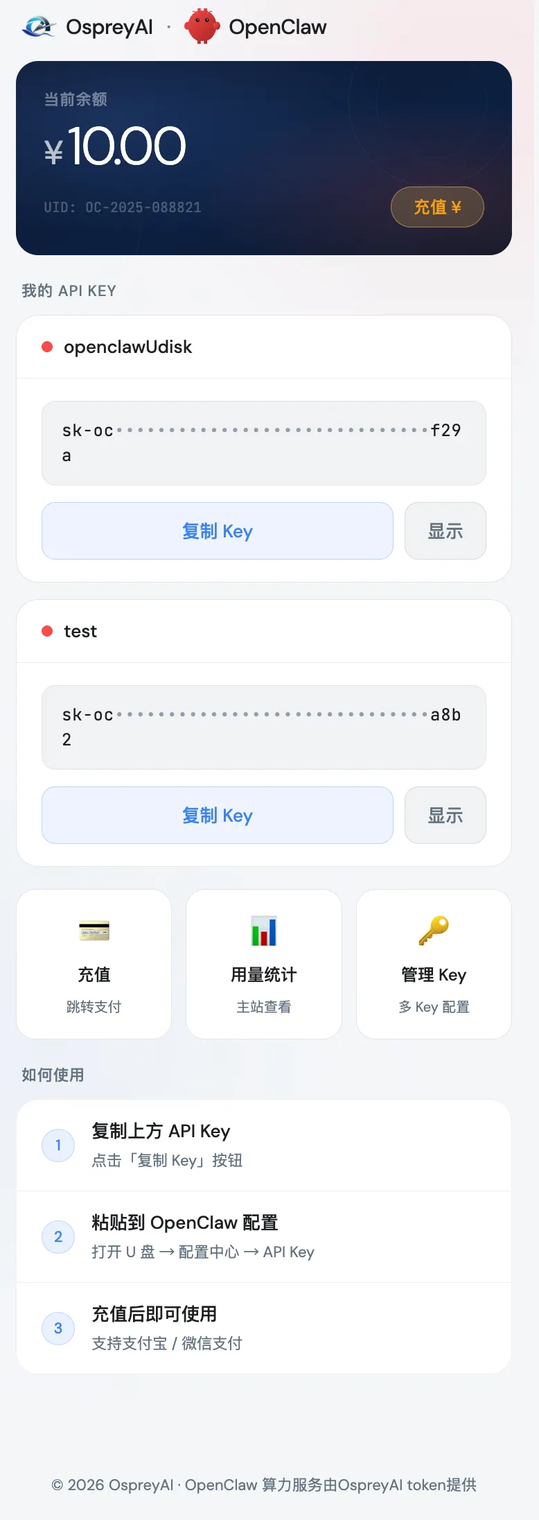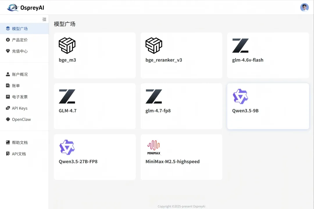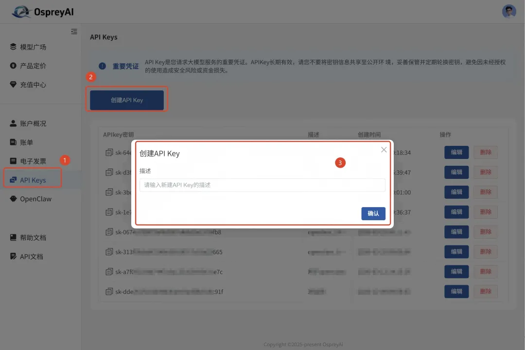 为简化用户接入流程,降低技术门槛,OspreyClaw控制台内置我司官方算力配置中心入口,实现一站式账号与API管理,全程自动化操作,无需专业技术基础: