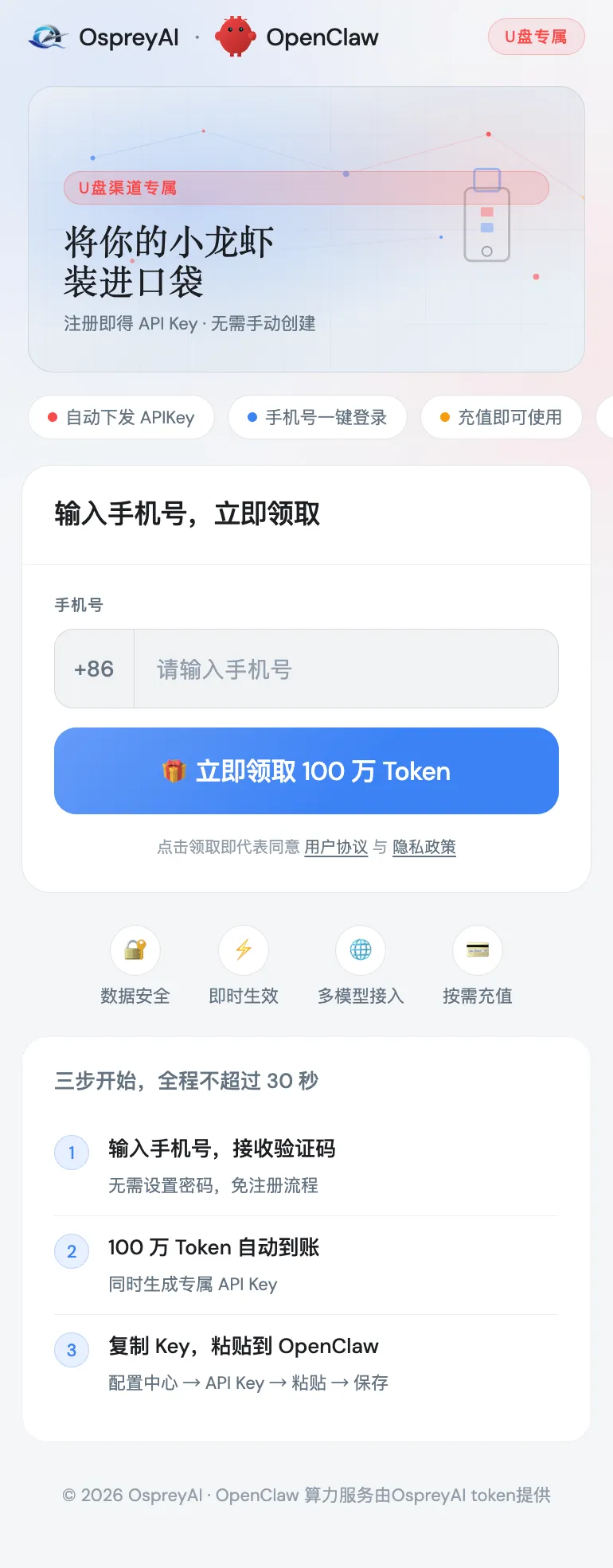 所有购买OspreyClaw龙虾U盘的用户,完成算力账号绑定与API激活后,自动获赠1,000,000免费Tokens额度,无门槛使用,无需预存、无需额外付费,可直接调用所有封装技能与算力服务,覆盖全场景使用需求。