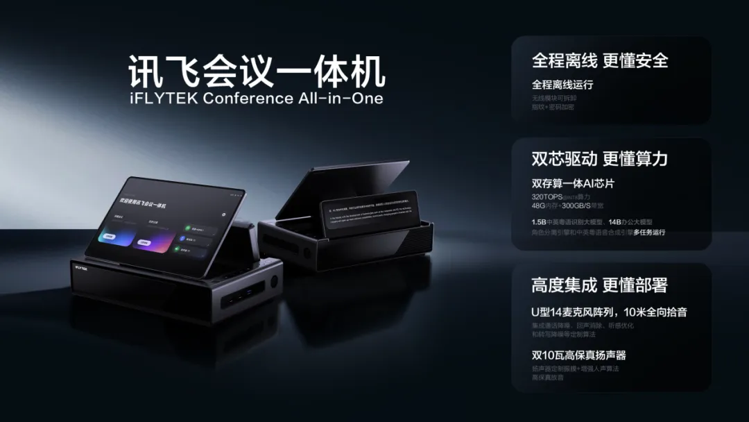 效率维度:降低会议时间成本。讯飞会议一体机搭载双存算一体AI芯片,带来320TOPS@INT8算力、48G内存+300GB/s带宽,可流畅承载1.5B中英粤和14B办公大模型等多任务并行。会中支持多语言实时播报与字幕同步,会后一键生成智能会议纪要,自动提炼核心议题与关键内容。这意味着,一场原本需要专人整理、翻译、核验的高端跨语言会议,会后整理成本被压缩至分钟级。