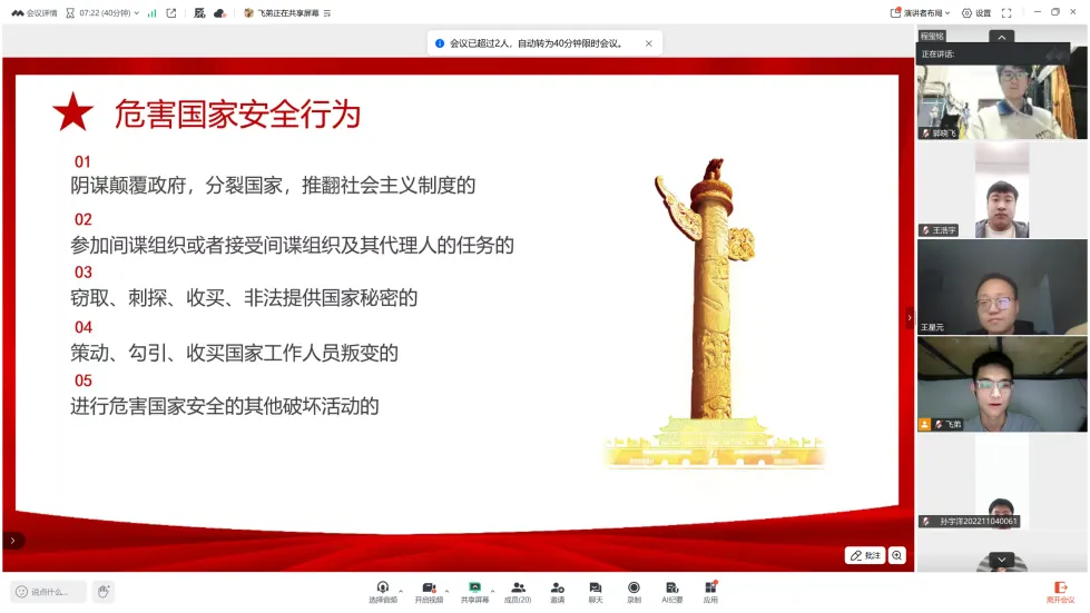 学院各年级以“三会一课”、主题党日、专题班会为载体,组织师生集中学习习近平总书记关于国家安全的重要论述、《总体国家安全观学习纲要》及《中华人民共和国国家安全法》《中华人民共和国网络安全法》《中华人民共和国反间谍法》等重要法律法规。学习会上,师生们共同研读国家安全相关知识,深入探讨政治安全、文化安全、科技安全、网络安全等与高校学习生活密切相关的领域内容。通过专题学习,引导师生深刻理解“国家安全无小事”,进一步树立“国家安全、人人有责、人人可为”的观念,切实将国家安全意识内化于心、外化于行。