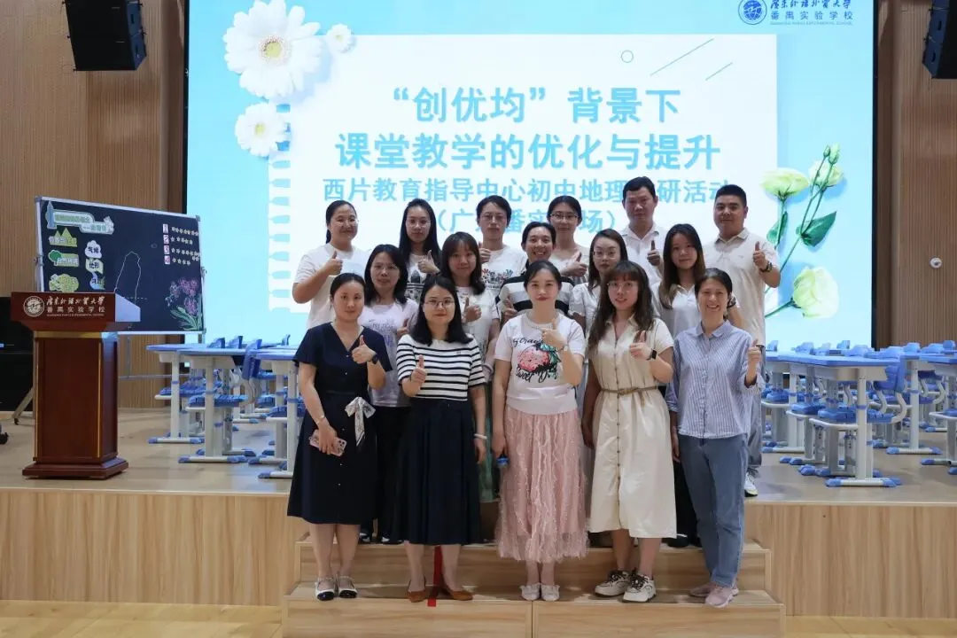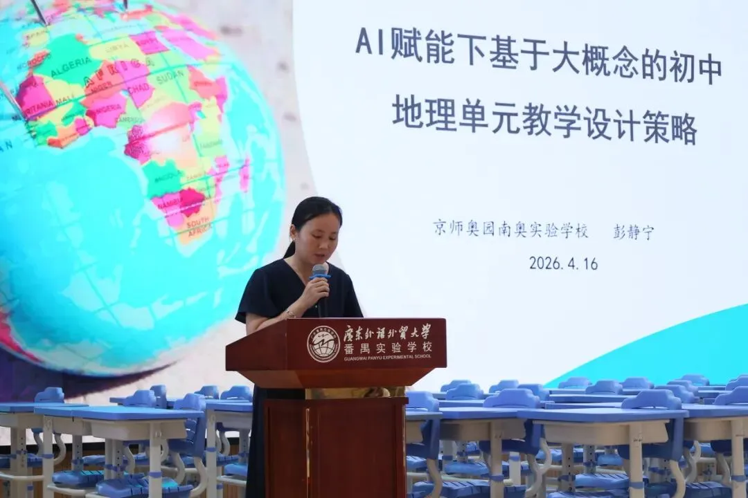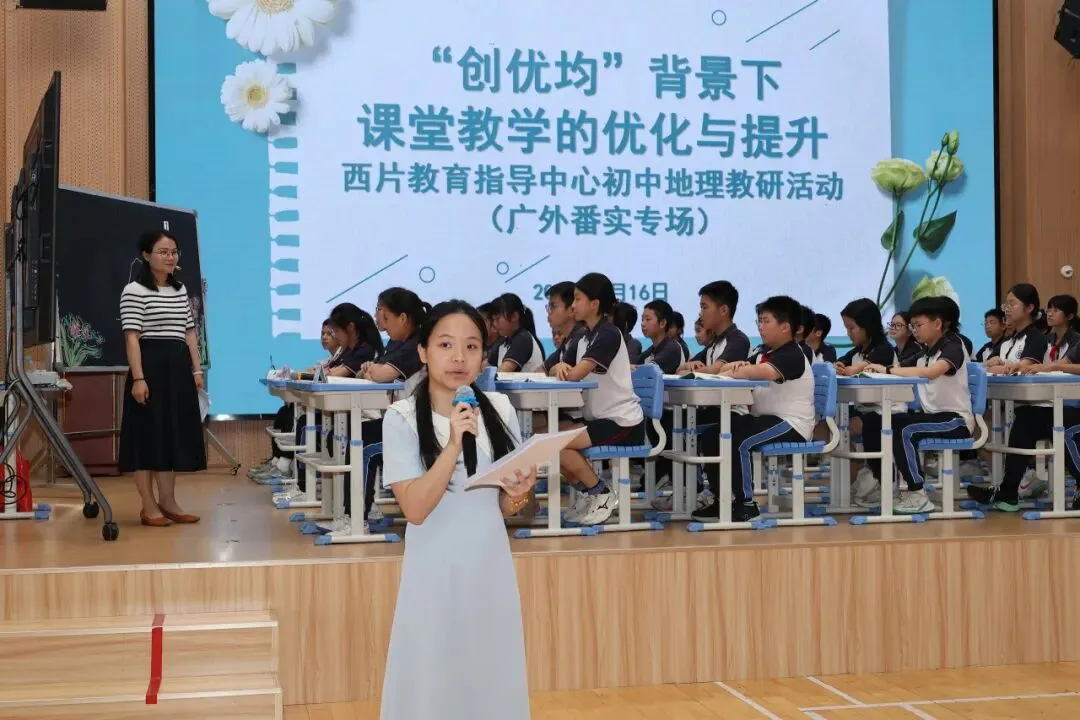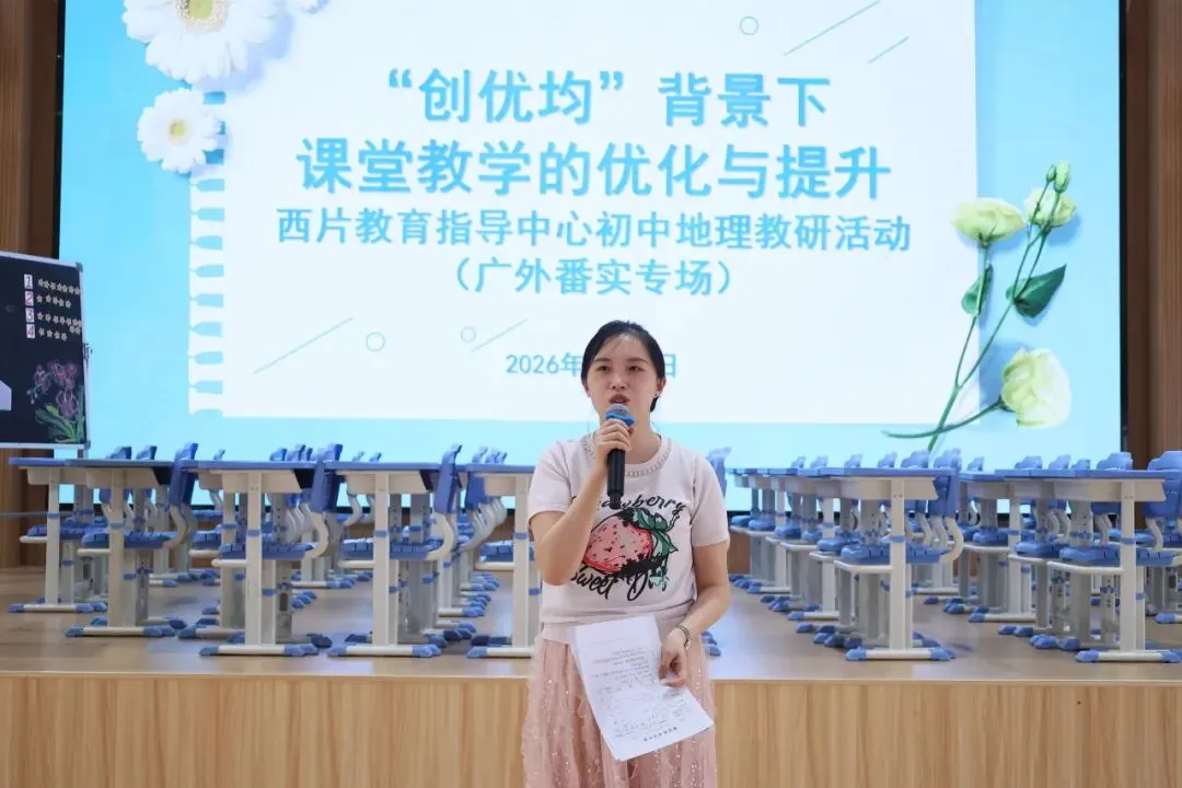 2026年4月16日下午,番禺区西片初中地理教研活动在广外番禺实验学校顺利开展。本次活动以“‘创优均’背景下课堂教学的优化与提升”为主题,聚焦核心素养落地、AI技术赋能与家国情怀深度融合,为区域地理教学提质增效搭建了交流研讨的优质平台。我校袁宇迪校长、张志华副校长、汪蓉校长助理、黎翔主任、黄梓杰副主任等领导亲临现场听课指导,充分彰显了学校对地理学科建设与教师专业成长的高度重视与鼎力支持。