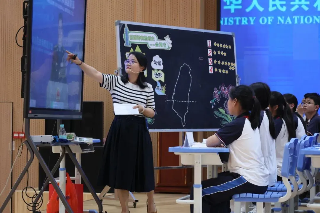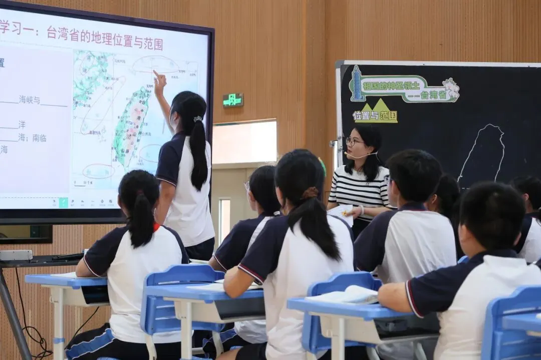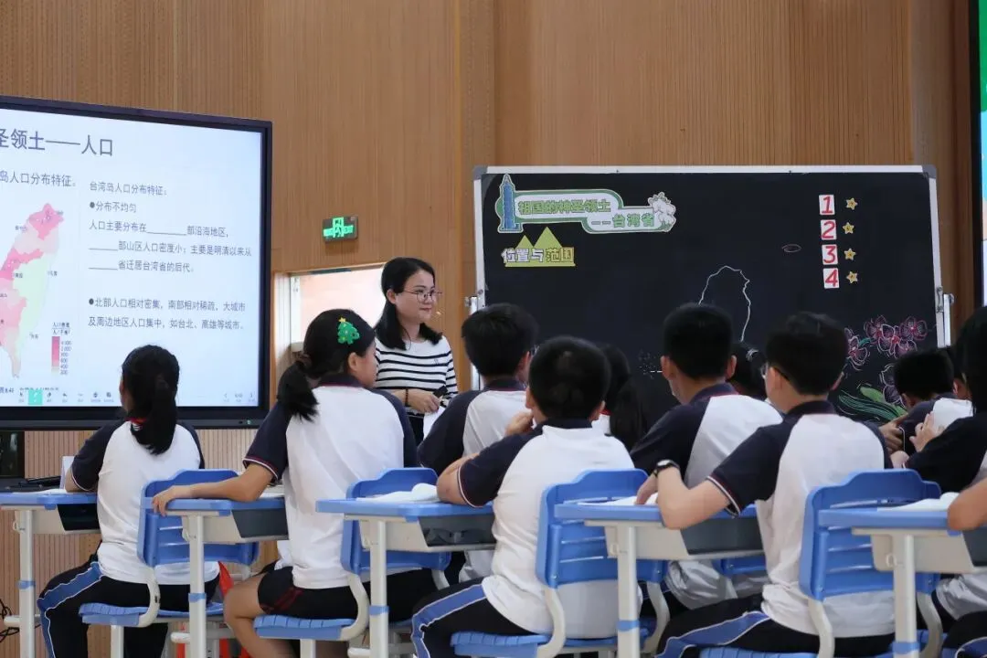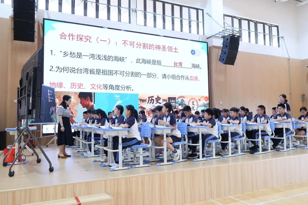 在主持人陈慧璇老师介绍活动流程后,我校吴唯香老师带来八年级下册示范课《祖国的神圣领土——台湾省》。课堂以余光中《乡愁》音频温情导入,瞬间营造出浓厚的家国情怀氛围,为整节课奠定了情感基调。