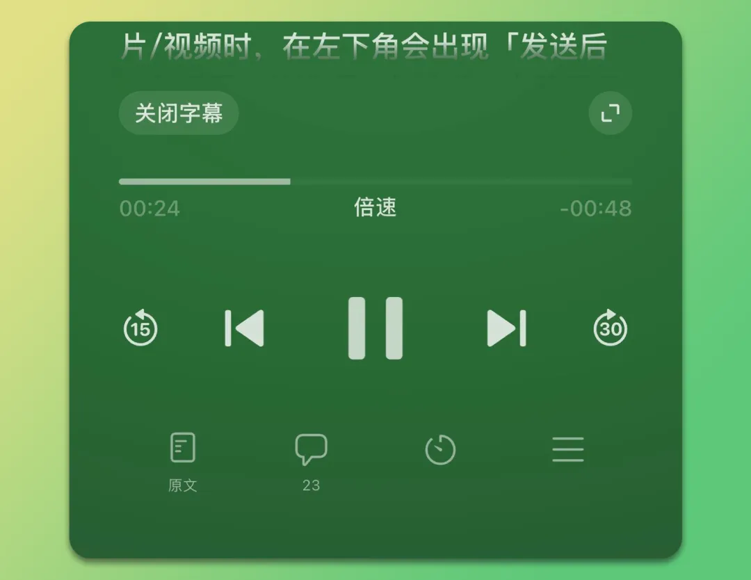 现在公众号文章支持听全文了,在微信文章顶部点击「耳机」按钮,可以选择开启朗读文章功能。进入播放器页面后,公众号名称下方新增“字幕”显示,轻触即可展开字幕,以大字的形式查看文字,并且可以上下滑动,还可以“关闭字幕”。