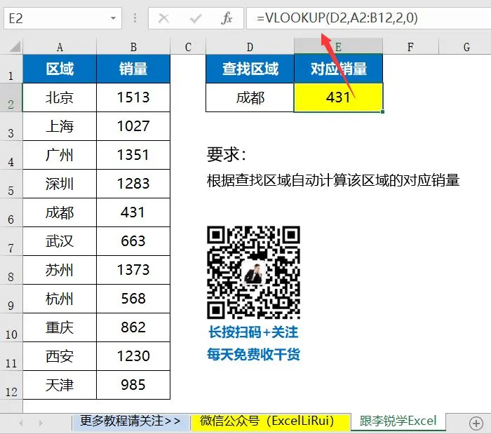 要求:根据查找区域查找自动计算该区域的对应销量。