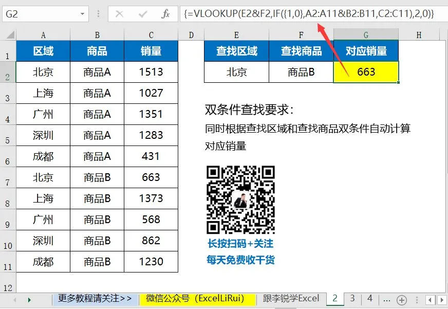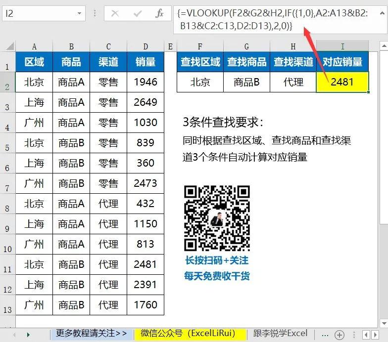 要求:同时根据查找区域、查找商品和查找渠道,自动计算对应销量。