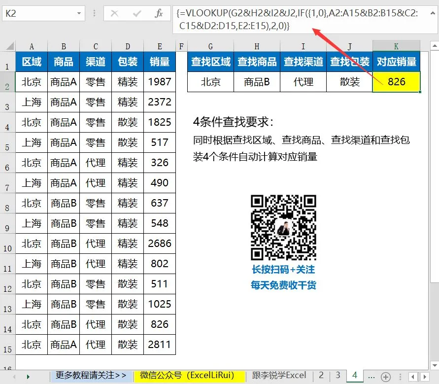 要求:同时根据查找区域、查找商品、查找渠道和查找包装,自动计算对应销量。