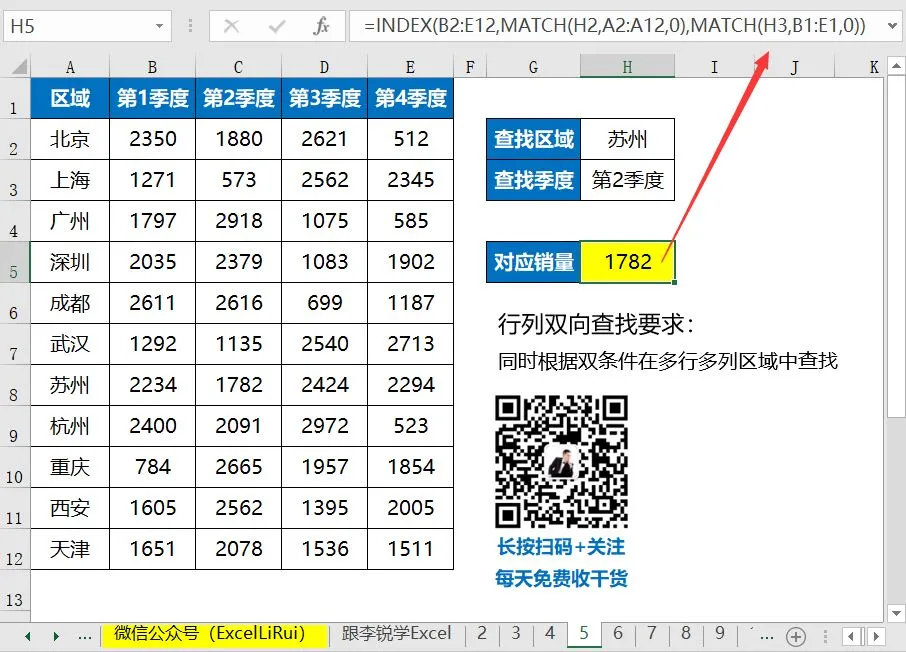 要求:根据双条件(分别在行列两个方向上)在多行多列区域中查找数据。