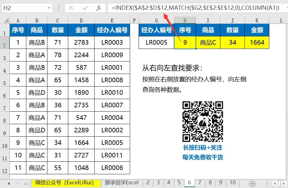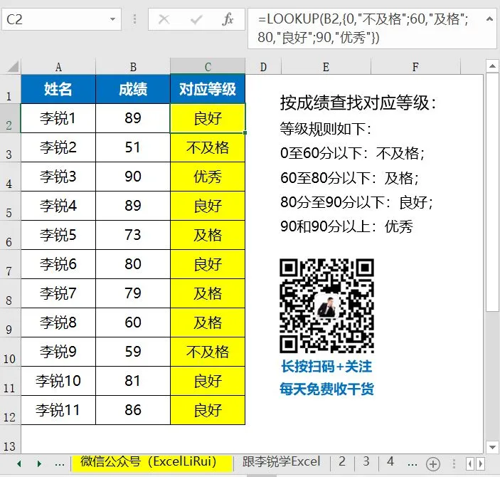 这个案例就是LOOKUP万能公式的应用之一,篇幅有限无法在这里展开讲了,想系统完整学习的同学请从下方公众号“跟李锐学Excel”底部菜单进知识店铺。