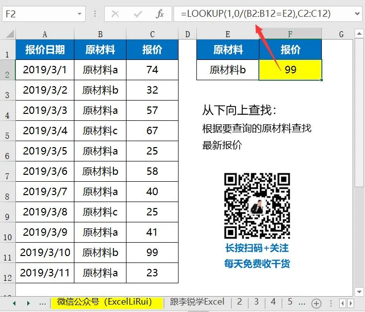 所以要求是根据要查询的原材料,在报表中从下向上查找其对应的报价。
