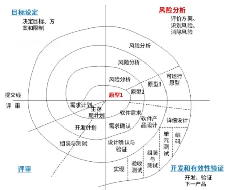 螺旋模型 | 风险驱动、多循环迭代、综合瀑布与原型优势 | 大型、复杂、高风险项目 | 优点:风险可控;缺点:流程复杂、管理成本高 |