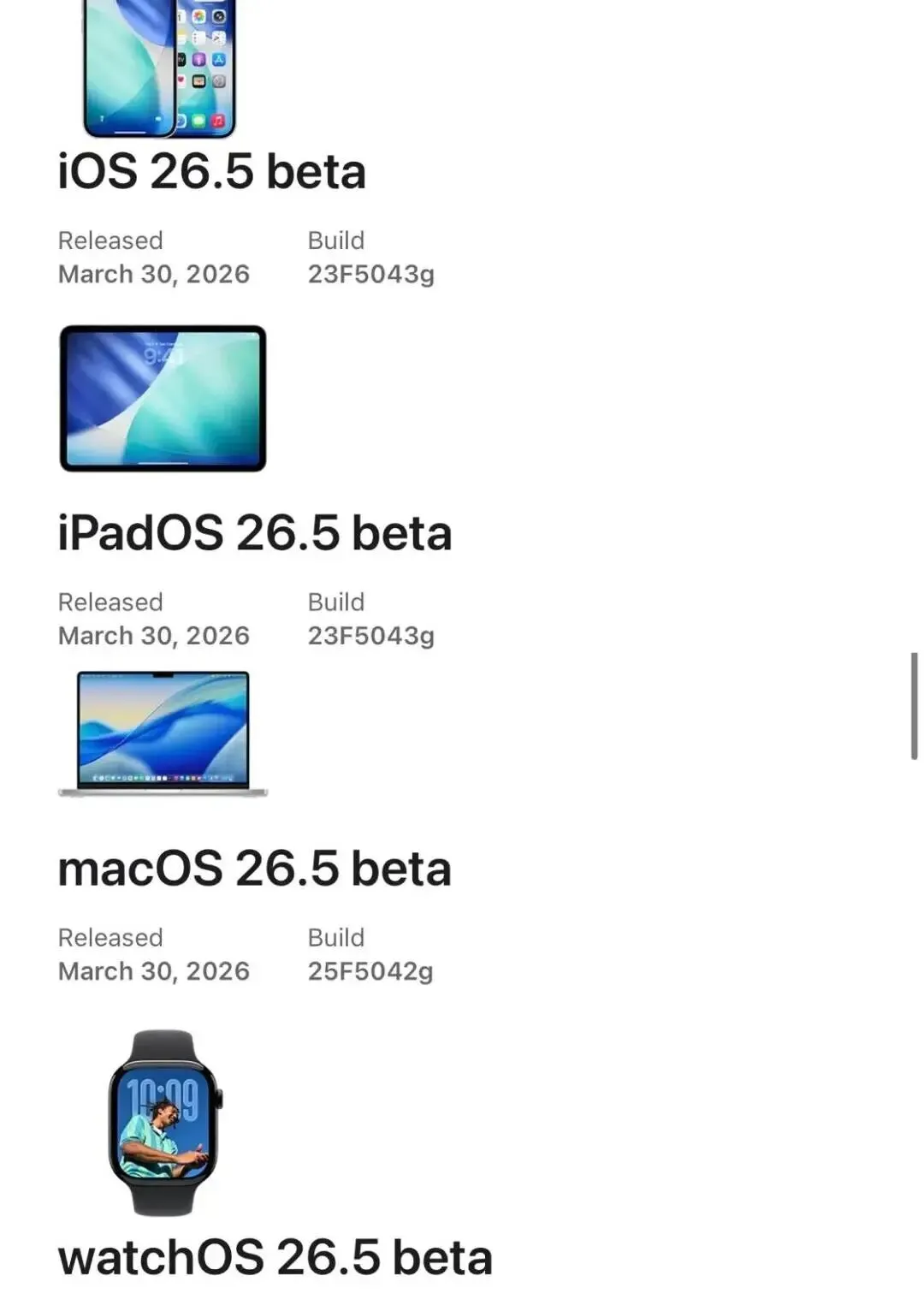 先说更新,开发者账号先拿到iOS 26.5 beta1,版本号23F5043g,同步还有iPadOS 26.5 beta1也是23F5043g,macOS 26.5 beta1是25F5042g,visionOS 26.5 beta1是23O5441g,watchOS 26.5 beta1是23T5541h,这串字母数字看着头大,对普通用户呢,看看就行
