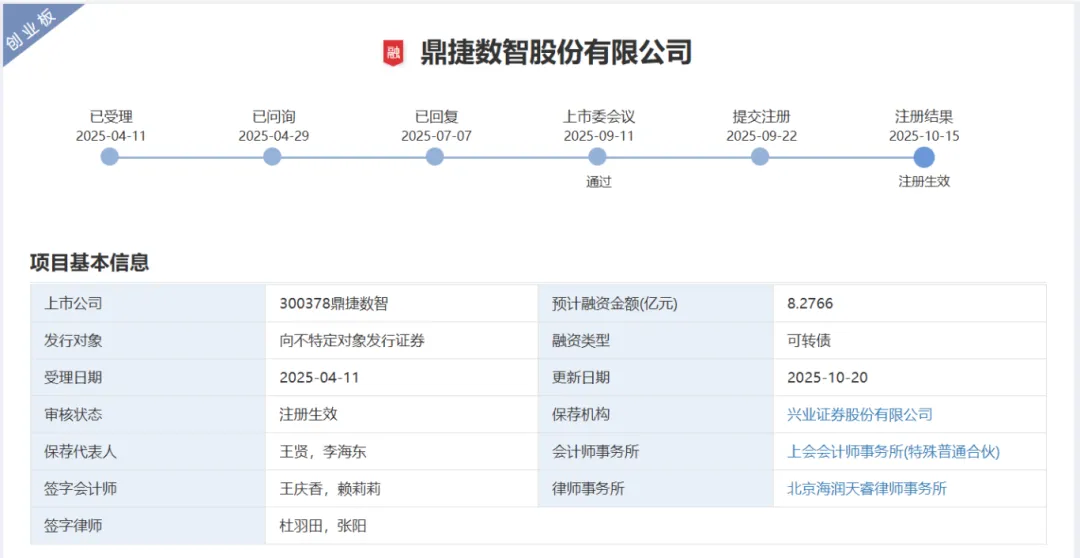 值得关注的是,2025年10月份,鼎捷数智在深交所创业板向不特定对象发行可转换公司债券的申请已注册生效。
