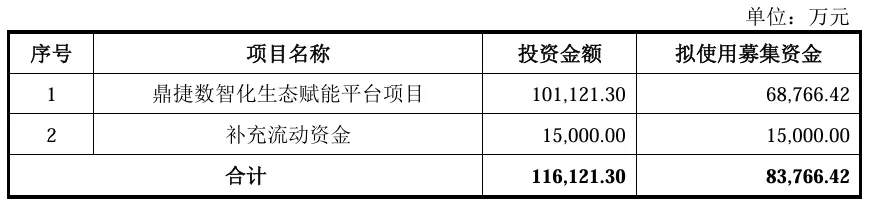 鼎捷数智本次可转债的发行总额不超过人民币8.38亿元。公司本次向不特定对象发行可转换公司债券募集资金扣除发行费用后募集资金净额拟投资于鼎捷数智化生态赋能平台项目、补充流动资金。
