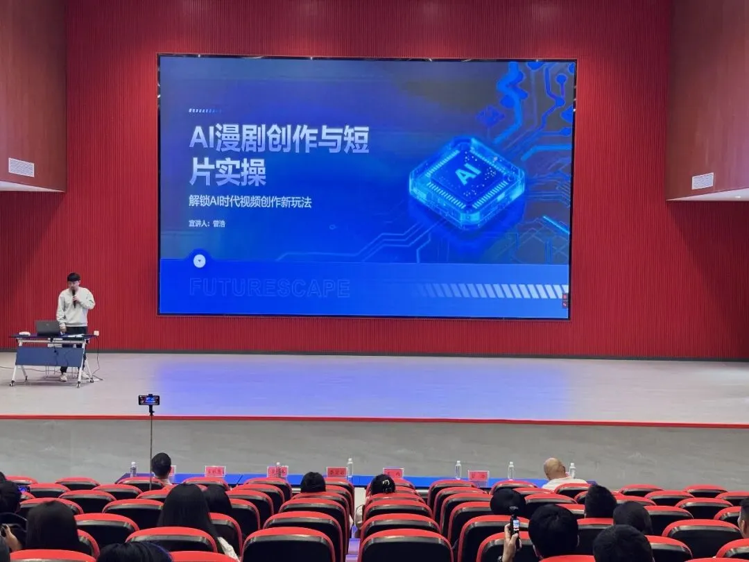 贵州省冻青动漫有限公司创始人曾浩以“AI赋能漫剧榕江”为主题,围绕人工智能助力民族文化数字化传播作专题授课。他结合当前火爆的AI漫剧发展趋势,详细讲解了如何利用AI视频生成工具(如Seedance2.0、可灵等)实现民族故事、非遗纹样、村超题材等内容的高效转化,并现场演示了从剧本到成片的快速制作流程。
