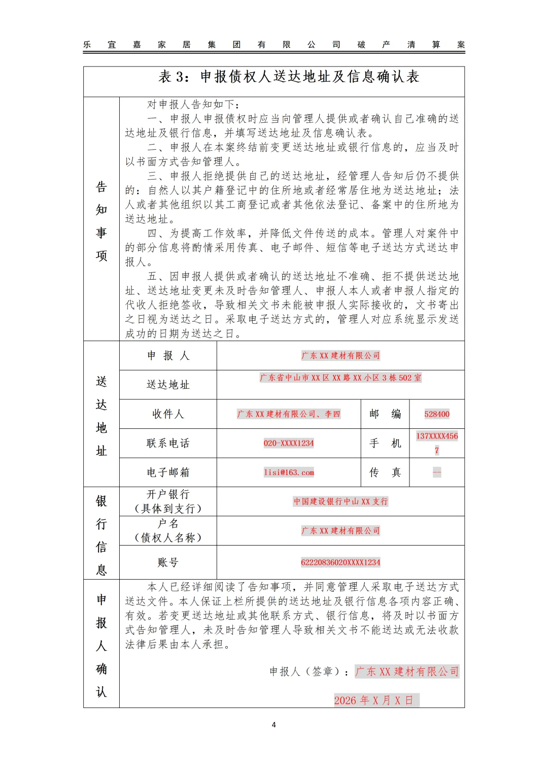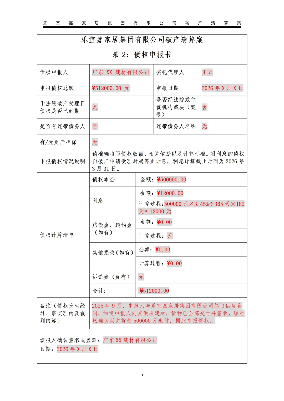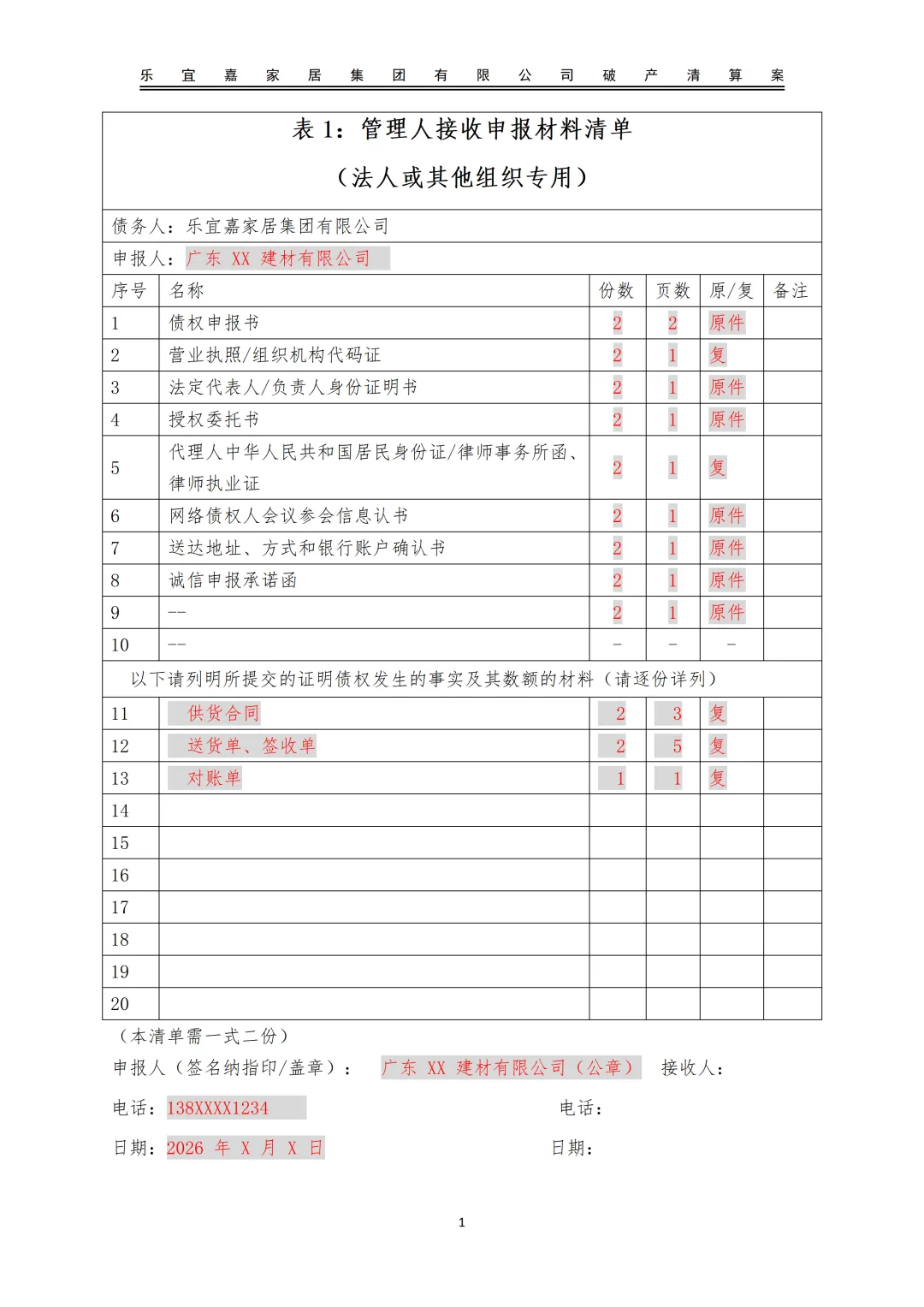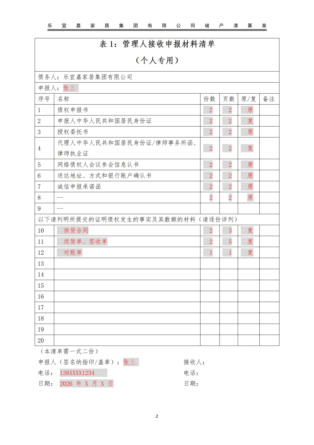 乐宜嘉家居集团有限公司 | (模板参考)债权申报表格