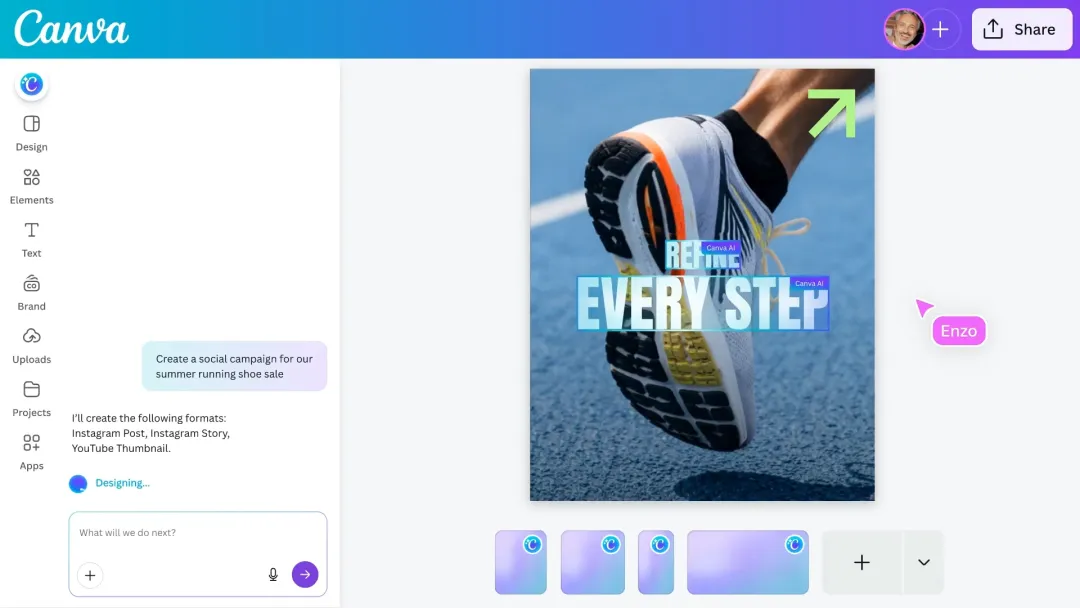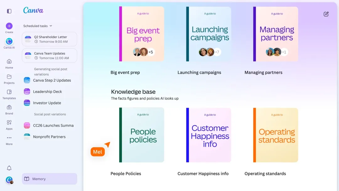 「智能编排」让 Canva AI 能主动选择工具并协调执行任务,在迭代过程中保持内容连贯。系统可理解用户意图并组合多种功能,完成从活动方案、演示文稿到社交内容系列的完整生成。