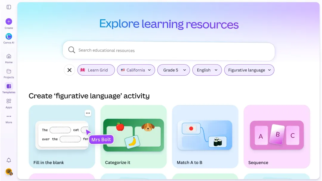 Learn Grid 是 Canva 内部一个专门用于学习的平台,它将数千个与课程相匹配、可直接使用的教学资源与 AI 驱动的活动创建功能整合到一个地方,所有内容都按年级、科目和学习成果进行分类。