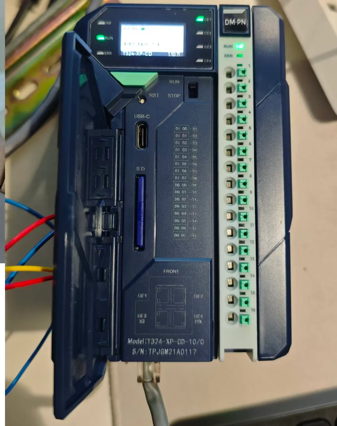 3、CPU本体24V供电,提供4个RJ45网口,一个ModbusRTU接口,一个Type-C接口,送了一个存储卡。CPU正面带一个显示屏,能显示CPU运行状态、内存占用率、通信负载量等信息。提供了一个物理的拨码开关,用于切换CPU的运行状态。前面板上共有7个指示灯,分别是INF(内部故障),RUN(运行),ERR(错误),GE1~4(4个千兆网口状态)