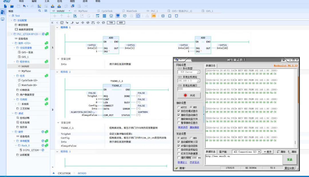 5、程序编完了,下载,看疗效吧。宝信PLC把自增的一个数组,发给网络调试助手.