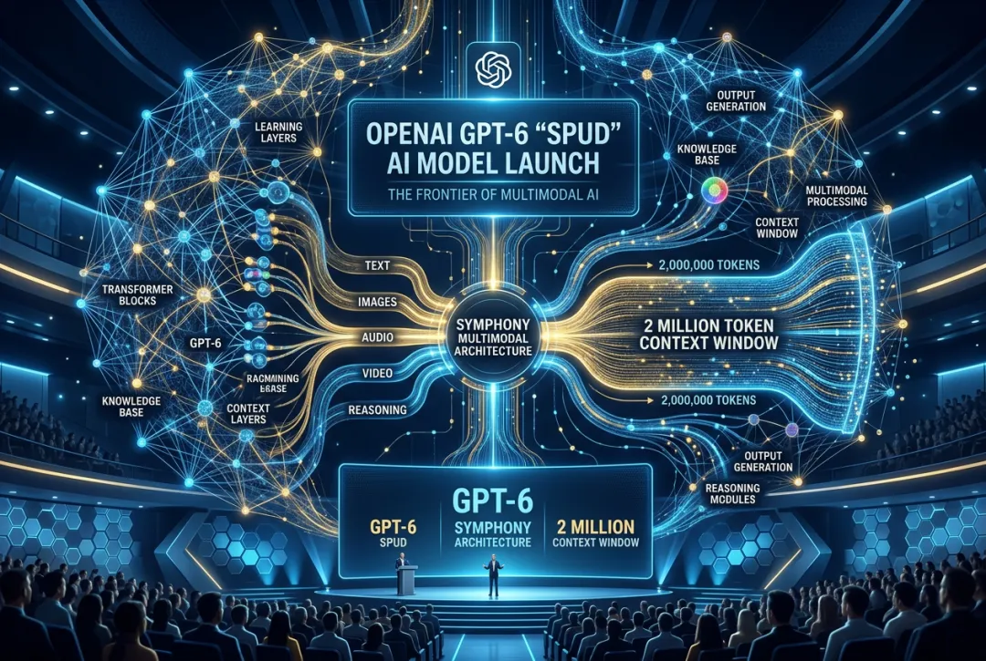 • 核心内容:GPT-6(内部代号"Spud/土豆")预训练于 3 月 17 日完成,采用全新的 Symphony 统一多模态架构,实现文本、图像、音频、视频的原生融合处理。上下文窗口扩展至 200 万 Token(较 GPT-5.4 提升 15.6 倍),推理速度提升 40%,代码生成、逻辑推理与智能体任务能力全面强化。