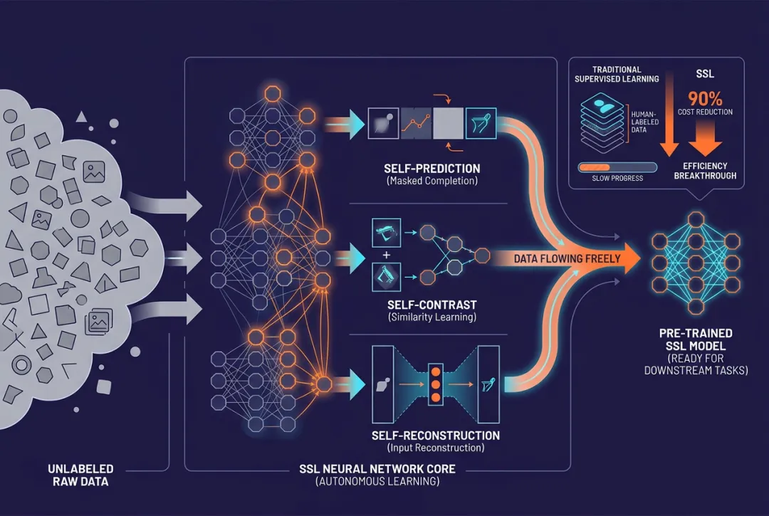 • 核心内容:新一代自监督学习方法通过自预测、自对比、自重构等机制,无需人工标注数据即可从海量无标注数据中学习高质量表征。该范式使数据标注成本下降 90% 以上,并显著提升小样本和零样本场景的泛化能力,为资源受限的中小企业和垂直领域应用提供了低成本落地路径。