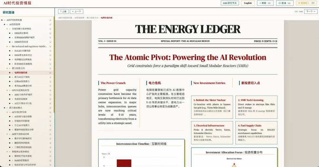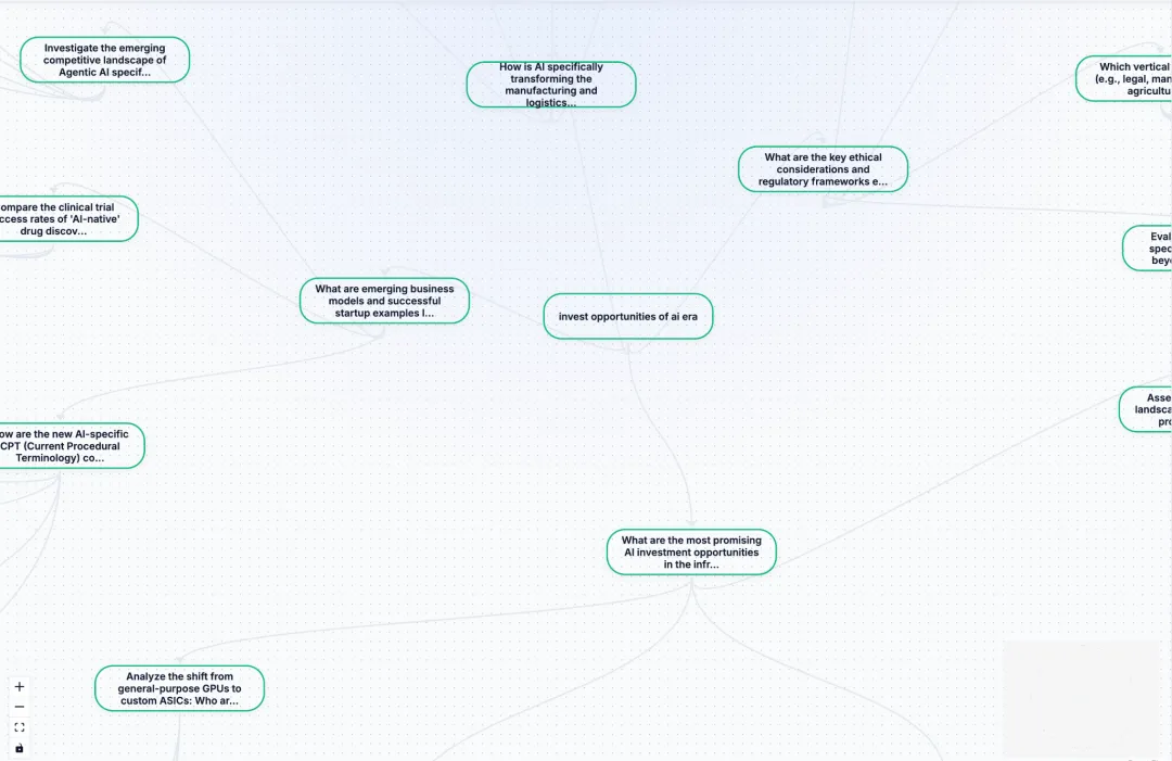 起点很简单,一句提示词而已:AI时代的投资机会。下图也正是这个起点问题的第一个回答的可视化。内容由Gemini-3-Flash和Gemini-2.5-Flash在Gemini Cli中合作完成,用到的工具只有一个:Web Search。可视化由运行在Mac Studio中的Gemma4-31b模型完成。