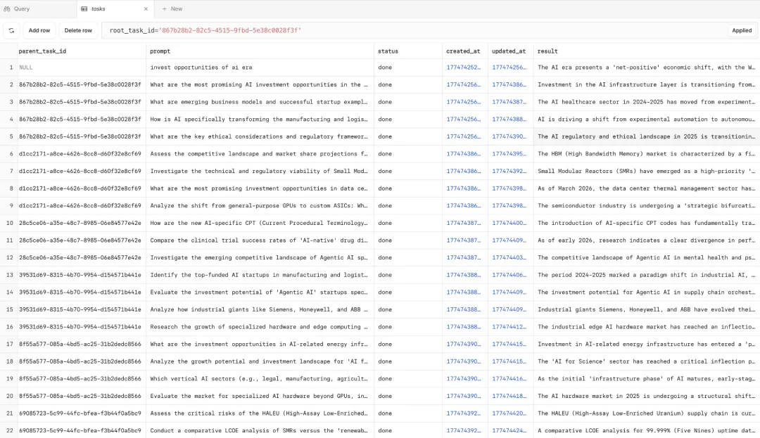 起点如上所述:AI时代的投资机会。上图中中央的节点,然后,就是不断迭代,每次迭代都调用Gemini Cli,两个任务,一是分析现在的问题,二是提出若干个发散性的问题,程序收到结构化的输出后,对发散性问题进行向量搜索,如果这个话题之前没有相似的,就接受,加入队列,等待被执行。