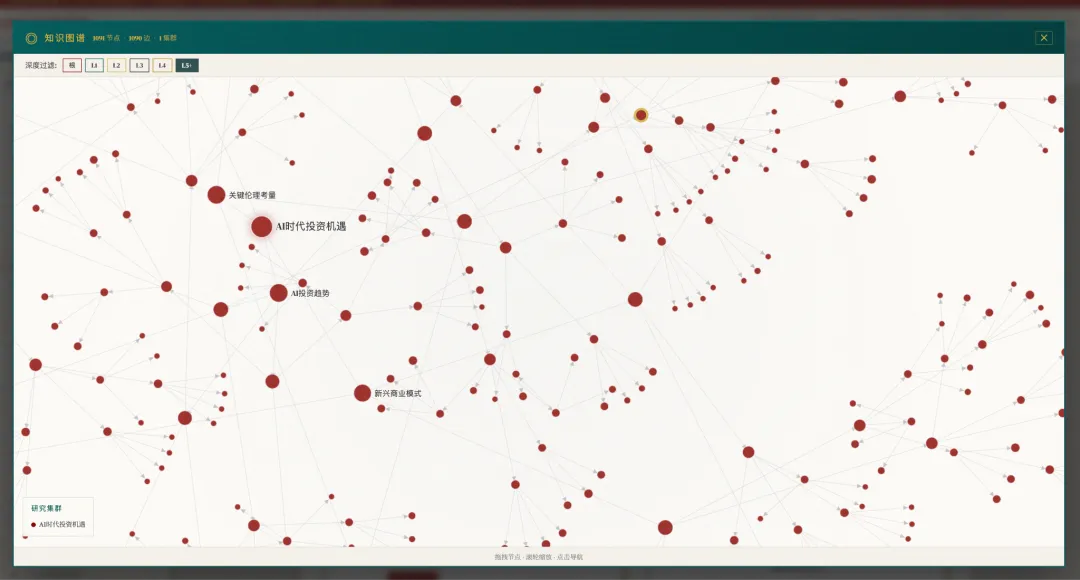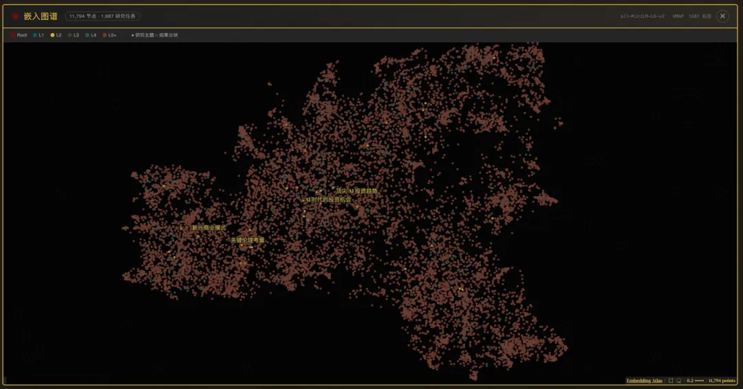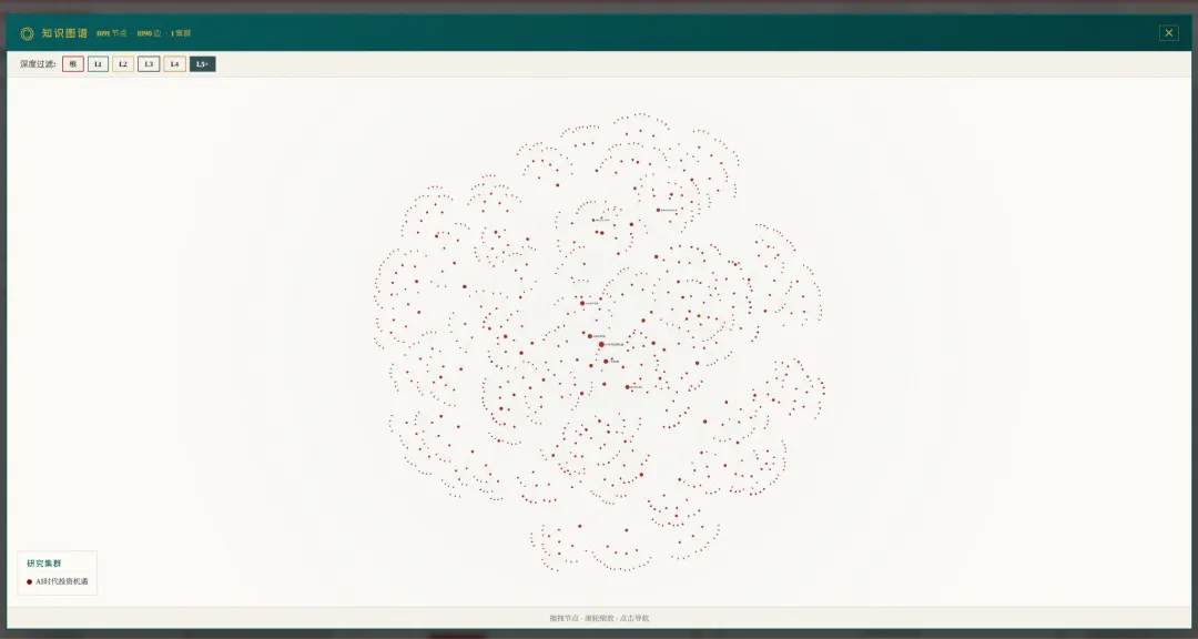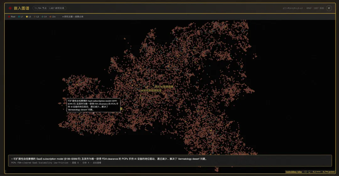 差不多十天时间,我做了很多尝试,当然最近一周更多是等待处理的过程,有几个不同层次的处理方式,今天拿出来展示的是相对完整但很线性的方法,没有我们想要的知识图谱(虽然看起来做了一个),没有逻辑思考的关联,更没有思考后的预测,当然,我加入了会引起“密集恐惧症”的embedding atlas,然后,如第一张图所示,我对每个节点进行了可视化,并展现成一本书的形式,有简单的搜索,但还不能称为wiki,因为没有反向链接。