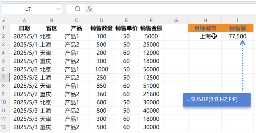 示例:如下图,根据左侧销售数据,统计目标省区和目标产品的销售额