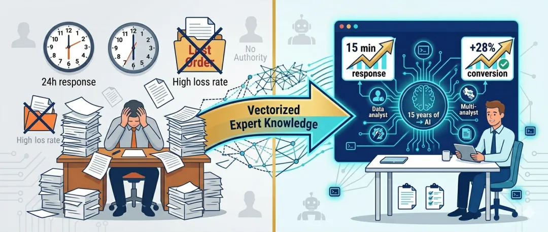 老板经过学习,没有要求全员写Prompt,而是只做了一件事:他抽调了两个销售冠军和一个资深工程师,花了两个月时间,把公司十五年的非标定制经验全部向量化,喂给了一个定制化的AI Agent。