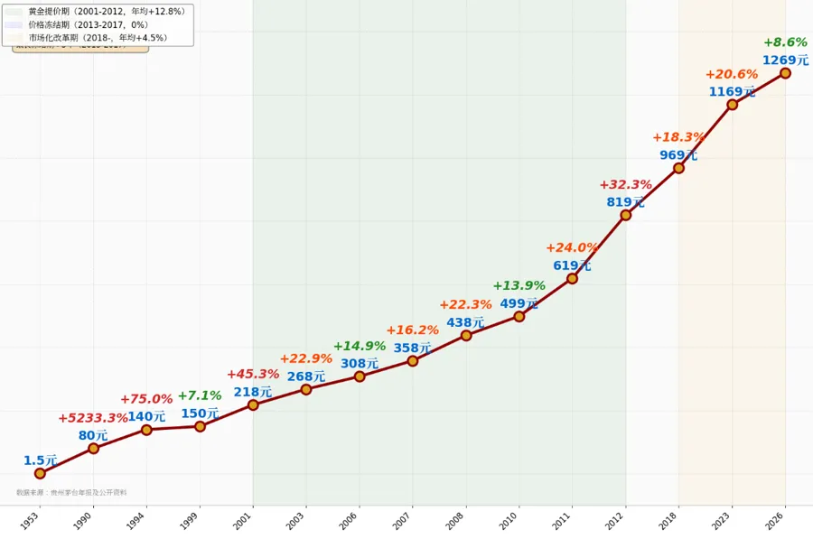 从2001年到2012年,飞天茅台基本每隔一两年就开始一次涨价,涨价幅度平均有20%左右,2012年之后,每隔四五年涨价一次,涨价幅度偏向温和,特别最近的这次2026年涨价幅度为8.6%,基本为涨价幅度最少的一次,但是可以想象一下,在白酒行业这么低迷的情况下,其他酒都要降价卖的基础上,茅台可以开启涨价,这里的含金量有多少,可以认真细品一下;
