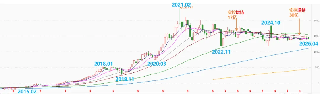 2021年资本市场触顶,然后开始一路平稳下滑,目前差不多是6折的价格,连续跌了5年,跌去40%,2023年、2025年茅台集团分别进行了17亿、30亿增持;