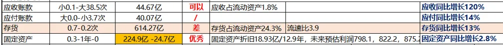 2025年应收款融资增加了45亿,道理也差不多,下游经销商系列酒销售困难资金有压力,通过银行汇兑回款,体量倒是不大,一点点而已,但是侧面反映的是销售端不太好,应付账款40亿,存货614亿,流速比3.9,前面介绍过了,存货问题不大,固定资产225亿,在建工程25亿,2025年固定资产折旧19亿,差不多是按13年折旧;