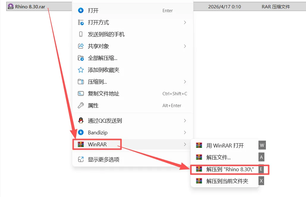 1、右击【Rhino 8.30】压缩包,选择【解压到Rhino 8.30】文件夹。