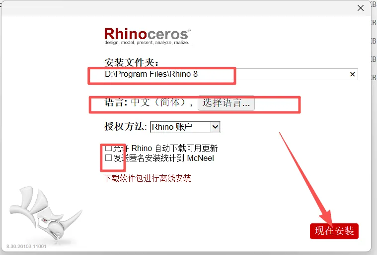 4、选择安装路径到非系统盘,语言选简体中文,取消方框内的勾,点【现在安装】。