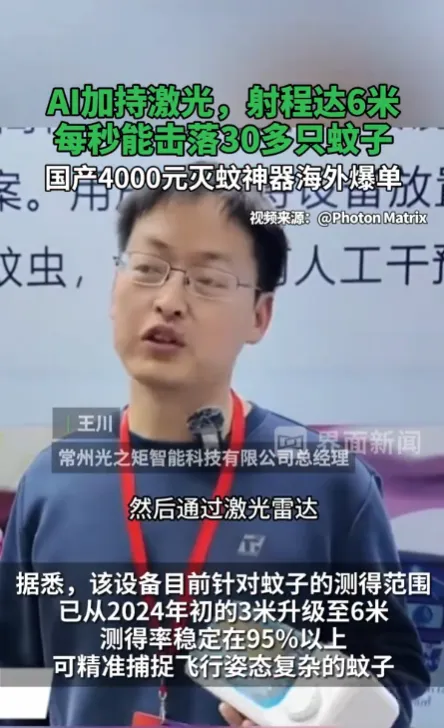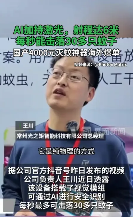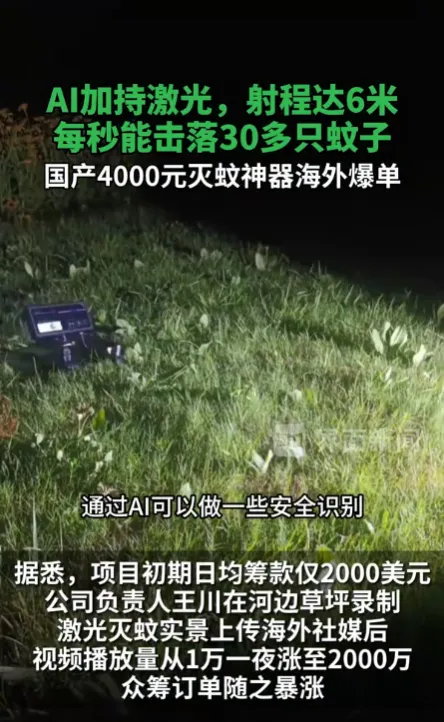 近日,常州光之矩智能科技有限公司研发的便携式激光驱蚊设备登陆海外众筹平台Indiegogo后迅速走红。该项目原定2万美元众筹目标,最终筹款超160万美元,达成率逾80倍,吸引2600余名海外支持者抢购一空。公司负责人王川透露,该设备搭载视觉模组,可通过AI实现安全识别,每秒最多可击落30余只蚊子。